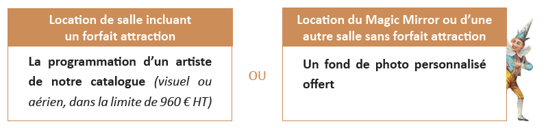 ✓ Privatisation d’une salle (Musée des Arts Forains, Théâtre du Merveilleux ou Salons Vénitiens)