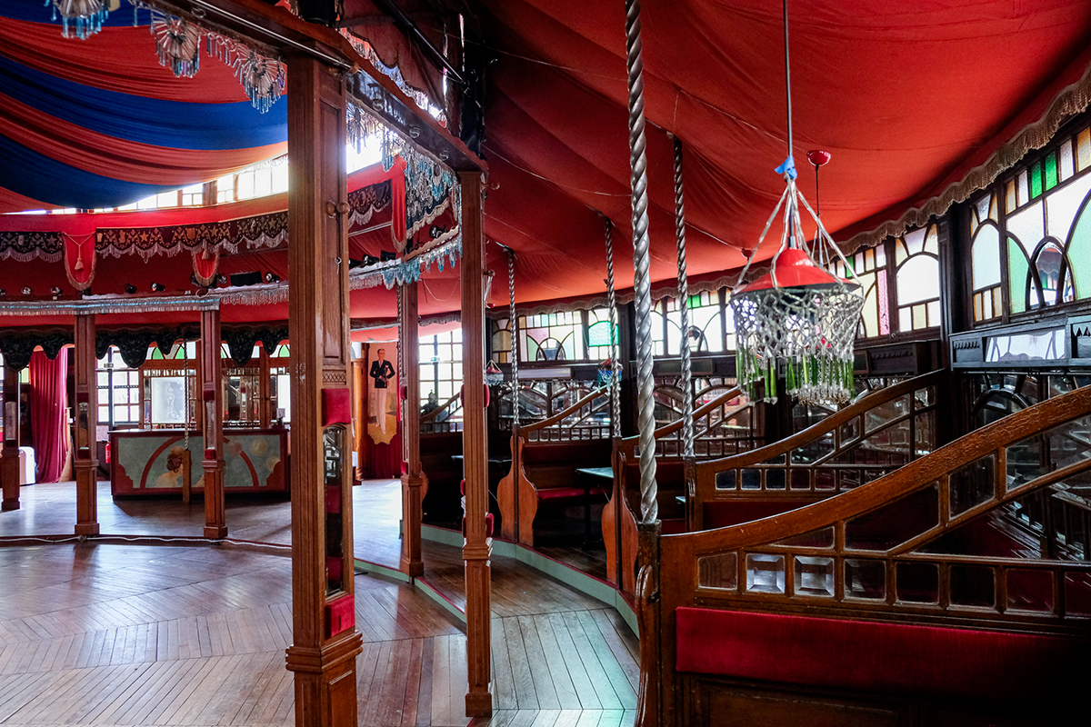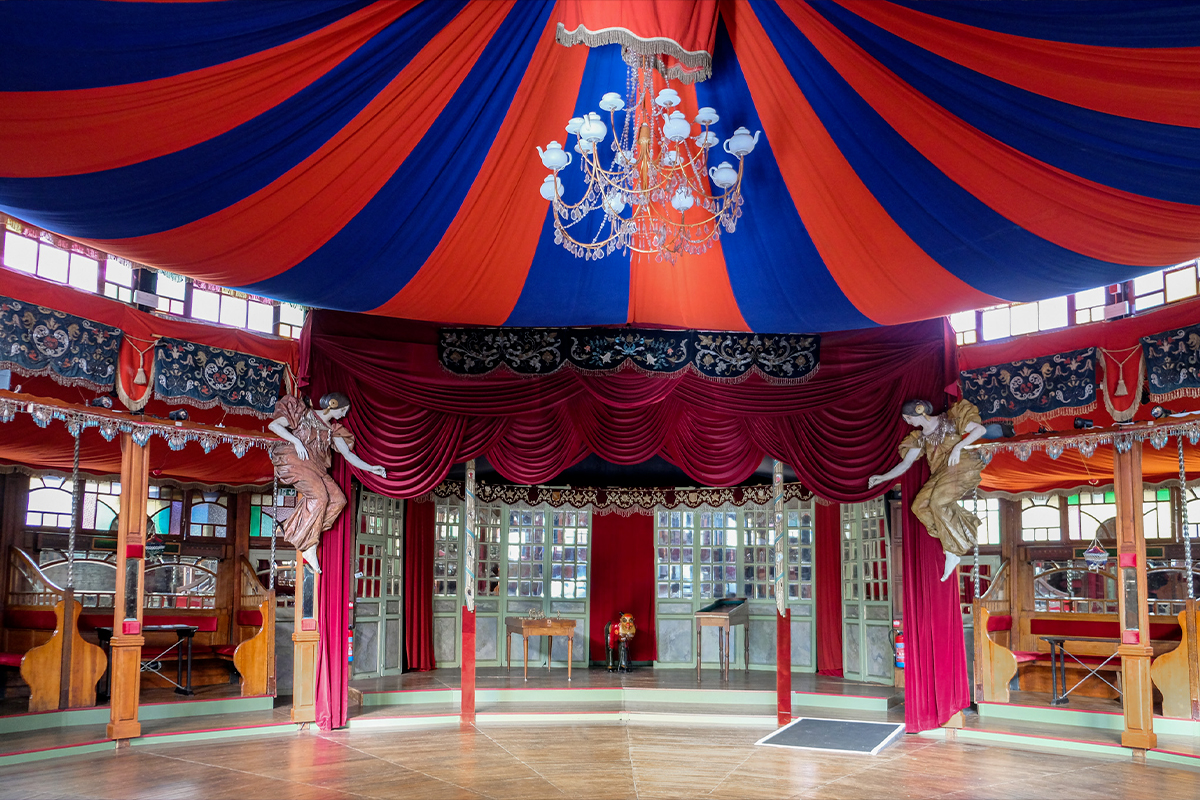 On en compte seulement six dans le monde qui soient d’origine, dont celui-ci. Datant de 1924, il est entièrement en acajou. A l’image des carrousels-salons qui amenaient la fête foraine de ville en ville, « cathédrales laïques qui eussent été classées si elles n’avaient été nomades », les « Magic Mirrors » apportaient la danse et la fête dans les villages.