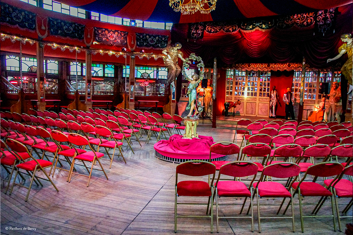 Cette dernière salle est arrivée aux Pavillons de Bercy en octobre 2014. Elle aura nécessité deux jours et demi de montage et plusieurs semaines d’aménagement. Aidé d’objets de sa collection, lambrequins aux perles de mercure, lustres et objets de curiosités, Jean Paul Favand a sublimé cette « tente à miroirs » en accentuant les jeux de reflets.