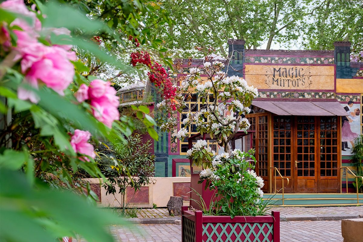 Les dix catégories de verreries différentes qui jouent avec la lumière du jour et l’éclairage et les lambrequins brodés de perles de mercure -restaurés au sein des ateliers du Musée des Arts Forains par une élève de la Manufacture des Gobelins- procurent la magie et l’émerveillement par des effets d’optique et des reflets de lumière uniques.