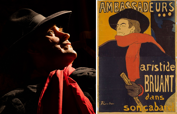 Fervent patriote, il s’engage pendant la guerre de 1870 en tant que franc-tireur pour défendre l’Empire. La défaite de la France le renvoie à la vie civile. Il travaille alors à l’écriture de poèmes et de chansons, puis commence à se produire dans les cafés populaires. Son succès grandissant lui permet de rencontrer l’interprète montmartrois Jules Jouy qui lui ouvre les portes du Chat Noir en 1881, cabaret aménagé par Rodolphe Salis. Côtoyant désormais l’élite poétique, toujours habillé de son fameux manteau noir, couvre-chef sur la tête et écharpe rouge autour du cou, Aristide Bruant, tel qu’il est présenté sous vos yeux, devient un motif courant des croquis son ami Toulouse-Lautrec. Il se spécialise dans les chansons de barrière, des complaintes qui magnifient le bas-peuple, et s’approprie l’argot. En le mêlant avec le folklore français et le chant d’église, son efficacité d’écriture l’élève sans conteste au rang des plus influents chansonniers montmartrois.