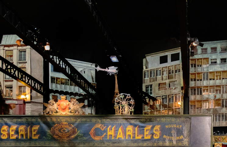 Bien avant les effets numériques, les réalisateurs et concepteurs d’effets spéciaux eurent recours à tout un tas de ruses pour montrer sur grand écran des choses irréelles ou lointaines. Les bâtiments présents au-dessus de la confiserie sont de ces objets. Réalisées en bois légers, ces façades d’immeubles éclairées permettent de filmer une grande ville à l’abri dans un studio. Il était alors aisé de filmer Paris dans les studios de Montreuil, ou New-York dans ceux de Rome !