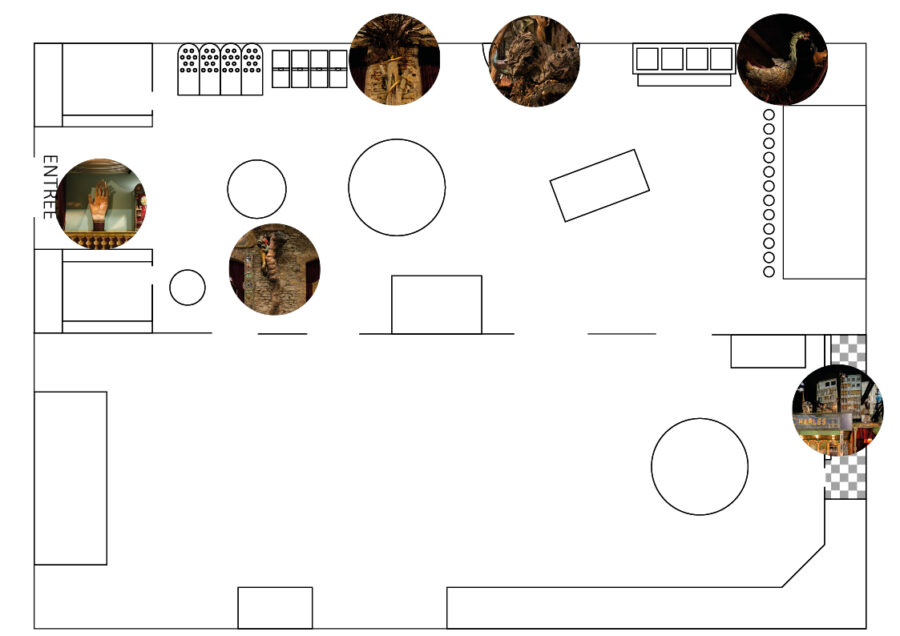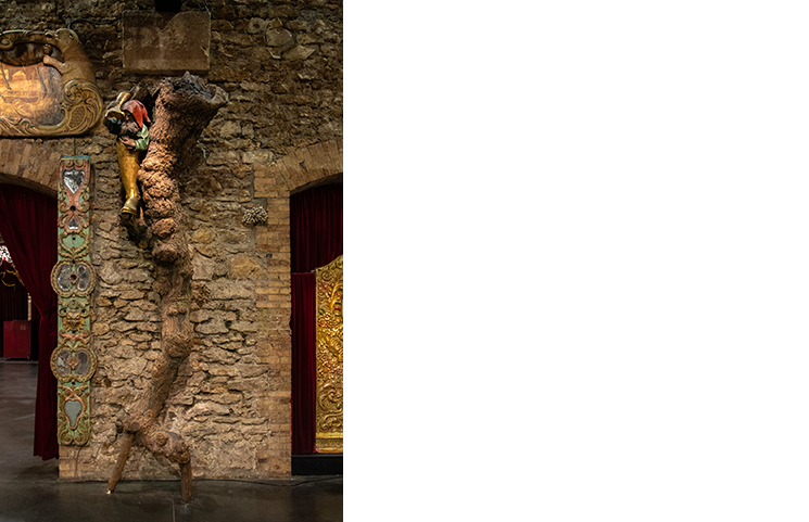 Ce tronc d’arbre abrite désormais une enseigne de bottier réalisée au 19e siècle au cœur de la forêt noire. Tel Charles Perrault dans ses contes, Jean Paul Favand a marié ces deux objets pour vous laisser créer de nouvelles légendes et histoires en laissant libre cours à votre imagination. Ce travail d’association et de positionnement des objets est mis en œuvre dans tout le Théâtre du Merveilleux, avec sa montgolfière à éléphant ou encore le bateau pirate composé d’éléments de décor de manège.