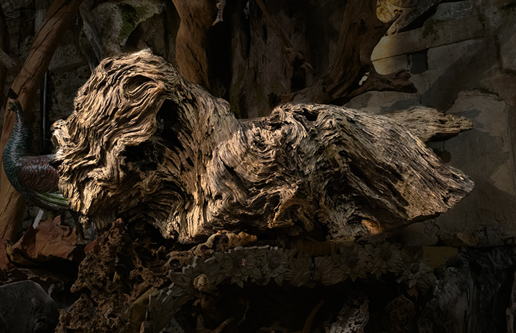 L’objectif n’est pas d’encadrer vos idées, mais bien de laisser votre imagination divaguer et voyager à travers cette forêt enchantée. Que voyez-vous dans les autres bois figuratifs à côté du lion ? Certains distinguent un buste greco-romain, une sculpture de tête de femme vous aide à voir une Japonaise en kimono dans un autre bois, un dodo se cache dans la grotte de la licorne, un dragon enserre dans ses crocs un coffre au trésor… et certains enfants plus ou moins grands ont même reconnu Syd de l’Age de glace.